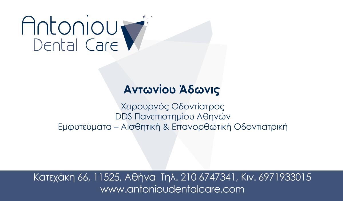 Αντωνίου Άδωνις, Κατεχάκη 66, Νέο Ψυχικό. Antoniou Dental Care. Τηλ: 210 6747341 Κιν: 6971933015 Email: Antonioudentalcare@gmail.com Www.antonioudentalcare.com