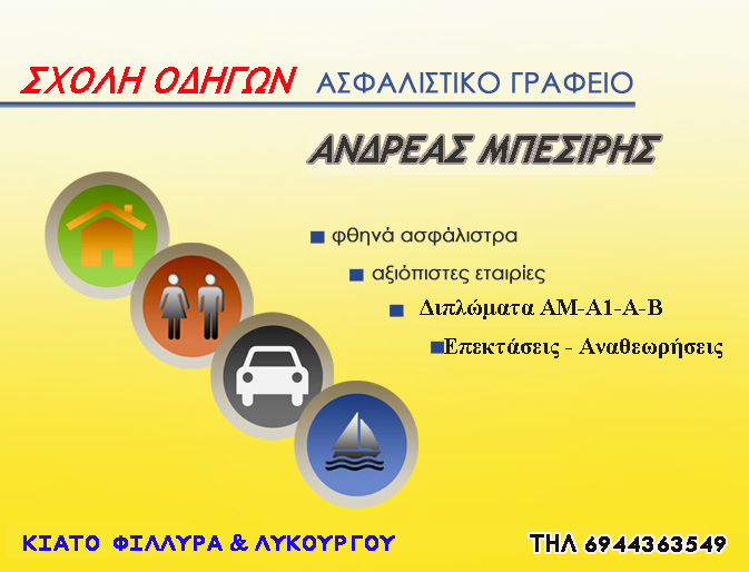 Ανδρεας Μπεσιρης, Φιλλυρα Λυκουργου 1, Κιατο. Σχολη Οδηγων Ασφαλιστικο Γραφειο. Τηλ: 2742026565 Κιν: 6944363549 Email: Info@abesiris.gr Www.abesiris.gr