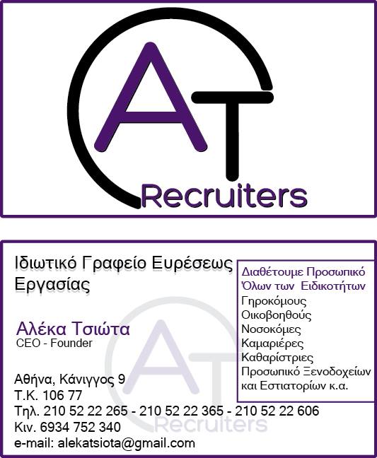 Οικοιακοί Βοηθοί | At Recruiters | Ελλάδα | Φροντίδα Ηλικιωμένων | Θεσσαλονίκη | Ι.γ.ε.ε. Αλεξάνδρα Τσιώτα | Οικόσιτο Προσωπικό | Αττική | Ξενοδοχειακό Προσωπικό | Εσωτερικό Και Εξωτερικό | At Recruiters