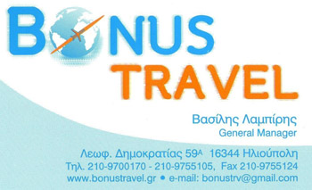 Λ. Δημοκρατίας 59Α, Ηλιούπολη, Ηλιούπολη. Λαμπίρη Email: Bonustrv@gmail.com Www.bonustravel.gr