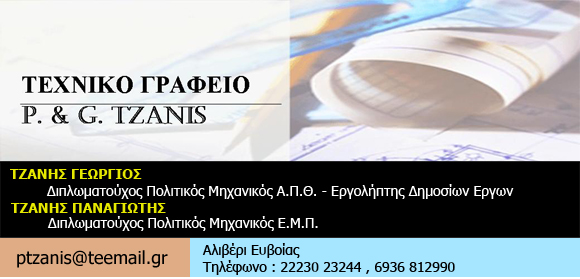 P.&G. TZANIS | Πολιτικοί μηχανικοί | Αθήνα | Χαλκίδα | Εύβοια | Βοιωτία | Πολιτικός Μηχανικός | Τεχνικό Γραφείο | Άδειες Οικοδομών | Τοπογραφικά Διαγράμματα | Ενεργειακές Επιθεωρήσεις | Άδεια Λειτουργίας | Τακτοποίηση Ημιυπαίθριων Χώρων | Νομιμοποιήση Αυθαιρέτων | Σχέδια Οικοδομών | Τεχνικές Μελέτες | Χαλκίδα | Εύβοια | Βοιωτία