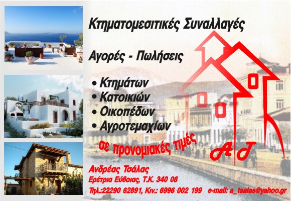 ΔΩΡΕΑΝ ΔΙΑΦΗΜΙΣΗ ΕΔΩ! Αγορές & Πωλήσεις Ακινήτων Κτήματα – Κατοικίες – Οικόπεδα – Αγροτεμάχια Ερέτρια Εύβοιας Αναλαμβάνουμε αγοραπωλησίες ακινήτων Αγροτεμάχια – Οικόπεδα – Σπίτια Όλα σε προσιτές τιμές