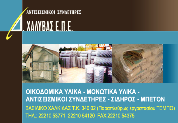 Οικοδομικά Υλικά | Βασιλικό | Χαλκίδα | Εύβοια | Δέλτα Χάλυβας Ε.Π.Ε. | Αντισεισμικοί Συνδετήρες | Μονωτικά Υλικά | Οικοδομικά Υλικά | Εμπόριο Σιδήρου | Κατασκευές Σιδήρου | Βασιλικό | Χαλκίδα | Εύβοια